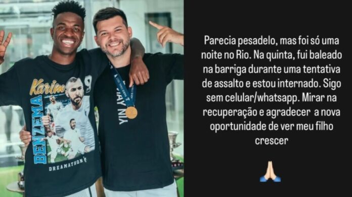 “PARECIA PESADELO, MAS FOI SÓ UMA NOITE NO RIO. NA QUINTA, FUI BALEADO NA BARRIGA DURANTE UMA TENTATIVA DE ASSALTO E ESTOU INTERNADO. SIGO SEM CELULAR/WHATSAPP. MIRAR NA RECUPERAÇÃO E AGRADECER A NOVA OPORTUNIDADE DE VER MEU FILHO CRESCER”, ESCREVEU.