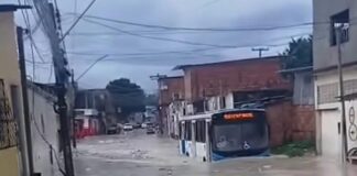 Ônibus atravessa rua alagada no Monte das Oliveiras e cena viraliza...