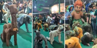 Atores fantasiados de animais chamam atenção ao rastejar durante performance na...