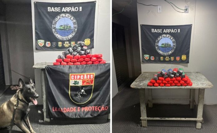 Durante a inspeção, que contou com o apoio da cadela policial Athena, os policiais militares localizaram os entorpecentes no interior de uma mochila, ocultos entre garrafões de água.