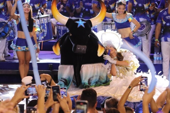 Quem surgiu do alto e conduzida ao palco foi a rainha do folclore, Cleise Simas, com a toada “Palmares, uma invasão Caprichoso”, mostrando leveza e arrancando gritos e aplausos da galera azulada.