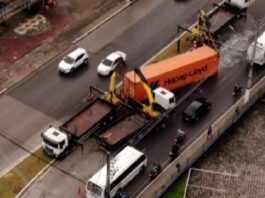 Na manhã desta segunda-feira (10), um contêiner carregado com 25 toneladas de bobinas de papelão se desprendeu de uma carreta e atingiu um carro...
