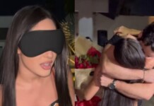 Isabelle Nogueira celebra 32 anos com festa surpresa e buquê do noivo, Matteus Amaral