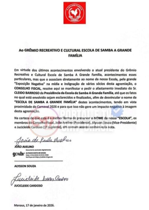 O Conselho Fiscal da escola de samba A Grande Família solicitou, neste sábado (17), o afastamento do presidente da agremiação, Cleildo Barroso, conhecido como “Caçula”, acusado de agredir a passista Marryeth Soares, de 29 anos. A decisão foi motivada pela necessidade de preservar a imagem institucional da escola diante da repercussão do caso.