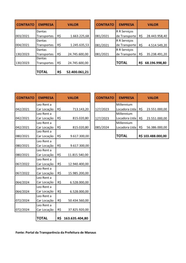As suspeitas são ampliadas pela concentração dos contratos em poucas empresas. A Leo Rent a Car Ltda, por exemplo, recebeu mais de R$ 163 milhões, o que corresponde a mais de 42% de todo o valor contratado no período. A ausência de informações públicas detalhadas sobre fiscalização, execução contratual e desempenho dos serviços reforça os questionamentos sobre a regularidade dos pagamentos efetuados pela gestão municipal.