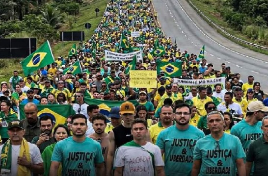 Brasil – O que estão compartilhando: uma foto que mostra os deputados federais Nikolas Ferreira (PL-MG), Gustavo Gayer (PL-GO) e André Fernandes (PL-CE) caminhando à frente de uma multidão em uma rodovia. Os manifestantes usam verde e amarelo e carregam bandeiras do Brasil.