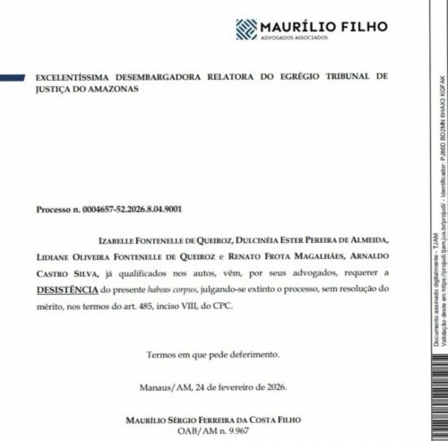 Já na manhã desta quarta-feira (25), por meio de advogado, os requerentes optaram por desistir formalmente do pedido. A homologação da desistência foi assinada pela juíza convocada Ana Maria de Oliveira Diógenes, da Câmara Criminal do Tribunal de Justiça do Amazonas.
