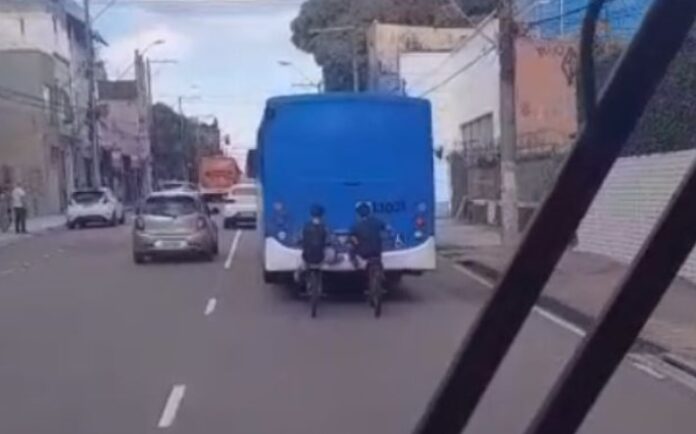 Dois jovens foram flagrados pegando “rabeira” em um ônibus enquanto estavam com uma bicicleta, na avenida 7 de Setembro, no Centro de Manaus. A cena foi registrada em vídeo por um motorista de outro coletivo.
