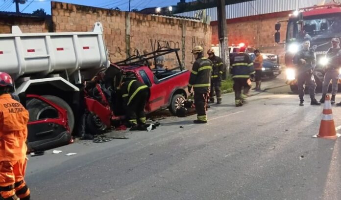 De acordo com informações, o veículo, uma Fiat Strada, colidiu na traseira de uma caçamba que estava parada na via.
