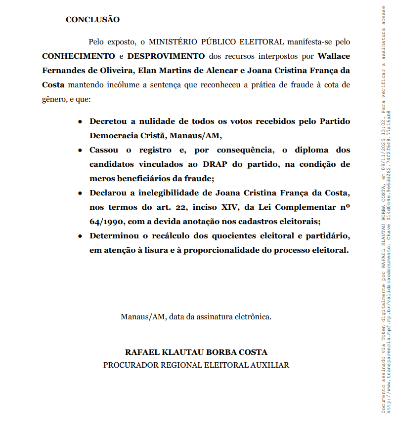 O parecer, assinado pelo procurador regional eleitoral Rafael Klautau Borba Costa, reconhece irregularidades nas candidaturas femininas do Partido Democracia Cristã (DC) e determina a nulidade dos registros e diplomas de todos os candidatos vinculados ao Demonstrativo de Regularidade de Atos Partidários (DRAP) da sigla.