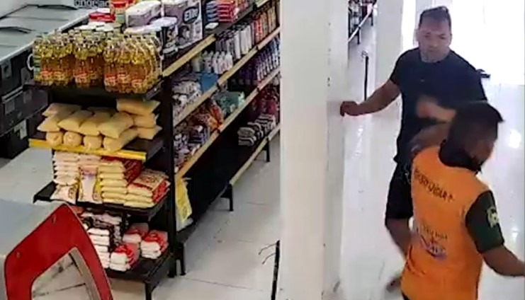 Em seguida, ele começa a agredir um dos funcionários que está de costas. A agressão segue no corredor do comércio. O balconista tenta se defender da agressão, mas o Policial Militar identificado como Claudemberg Lofiego volta a agredi-lo com socos.