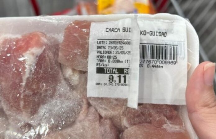 Entre as infrações constatadas, os fiscais encontraram bandejas de carne suína com a data de validade adulterada: a etiqueta original com o vencimento dia (25/05) foi sobreposta por outra com a data (28/05), de maneira visivelmente perceptível ao consumidor. Também foram encontrados produtos como limpador, salsicha, moela de frango congelada, lava-roupas, filezinho de peito e sardinha em condições inadequadas.