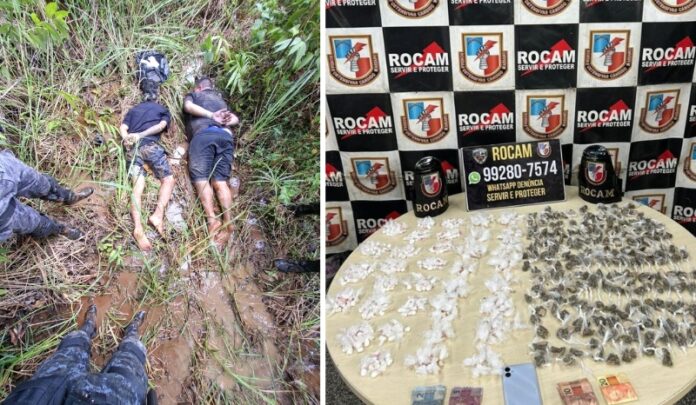 Segundo a polícia, a equipe realizava motopatrulhamento quando avistou um grupo em atitude suspeita na rua Flor de Reis. Ao perceber a aproximação da viatura, os suspeitos fugiram para uma área de mata, mas dois foram alcançados e abordados.