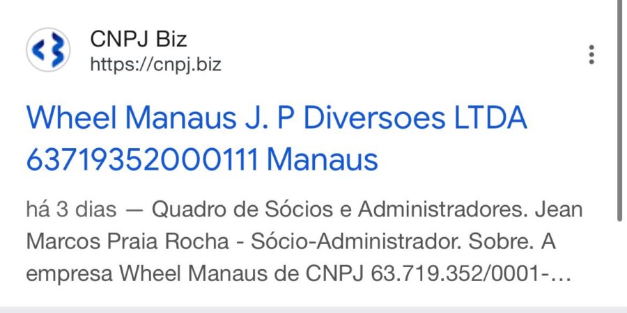Levantamento junto à Receita Federal revela que a empresa foi aberta há apenas três dias, em 18 de novembro de 2025, e pertence ao empresário Jean Marcos Praia Rocha, com capital social de R$ 300 mil, localizada na Avenida Autaz Mirim, 6798, bairro São José Operário, zona Leste de Manaus.