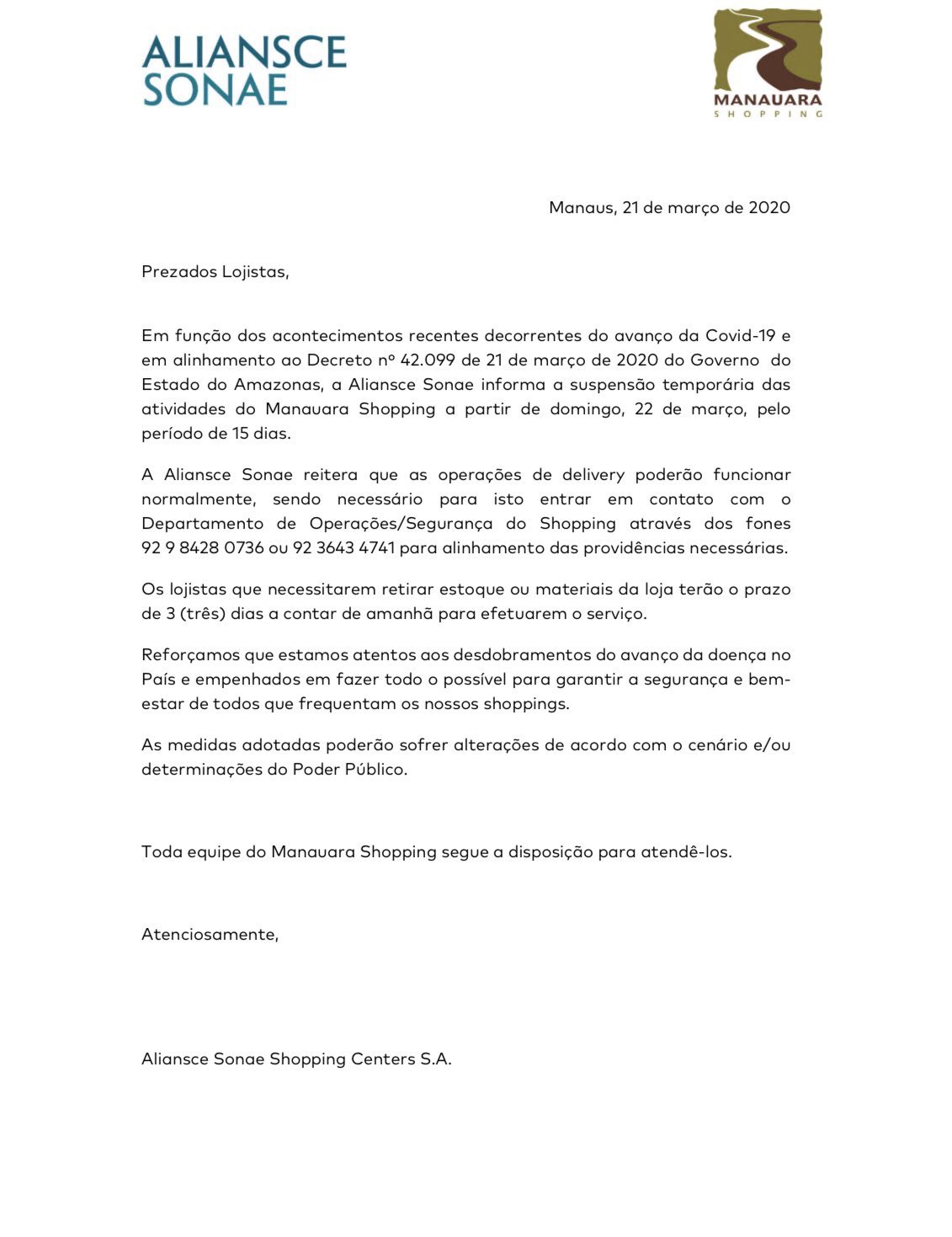 O Amazonas Shopping também anunciou a suspensão das suas atividades pelo mesmo período de dias.