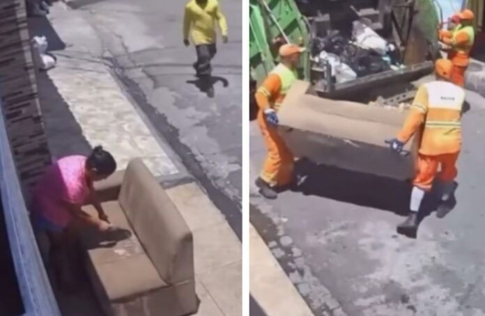 O que Fabiana não esperava era a pontualidade da equipe de coleta de lixo. Câmeras de vigilância registraram o momento em que ela deixava o sofá na rua; ao passarem pela via, os coletores interpretaram o móvel como descarte e, em poucos segundos, retiraram o sofá da calçada, levando-o embora.