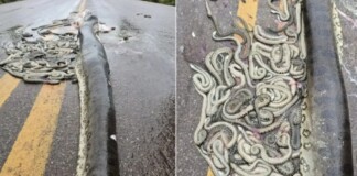 Sucuri grávida morre atropelada e mais de 100 filhotes são expelidos...