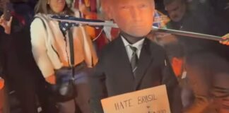 Manifestantes queimam boneco de Trump em ato contra tarifaço na Paulista
