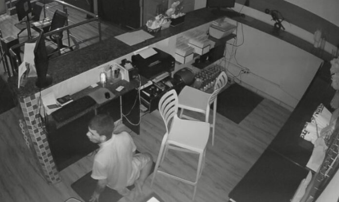 Câmeras de segurança registraram o momento em que o suspeito entra na academia, por volta das 22h, vai até a área da recepção e passa a revirar o local em busca de objetos de valor.