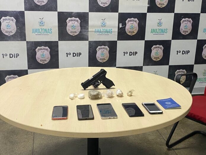 Após o roubo na Via Láctea, em Adrianópolis, os suspeitos foram capturados pela PM na Rua Belo Horizonte. Com eles foram apreendidos cinco celulares roubados, a arma falsa e cinco trouxinhas de entorpecentes.