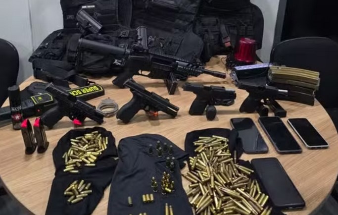 Entre os itens recolhidos estão pistolas, um fuzil calibre 5.56 com seis carregadores, dezenas de munições de diferentes calibres, algemas, celulares, detector de metal portátil e um bote de alumínio com motor de 300 HP.