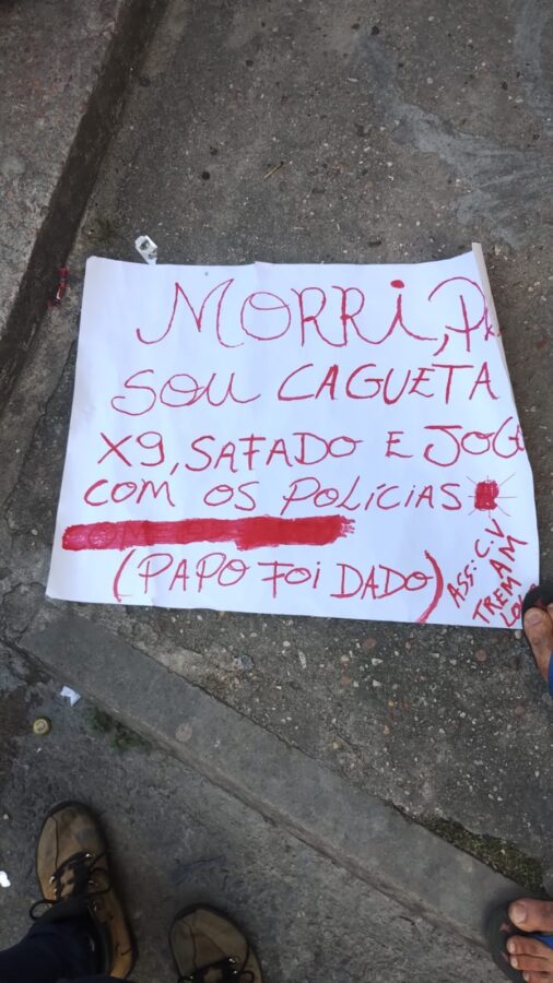 “Morri porque sou cagueta, X9, safado e jogo com os policiais. (Papo foi dado). Ass: CV AM Trem Loko.”