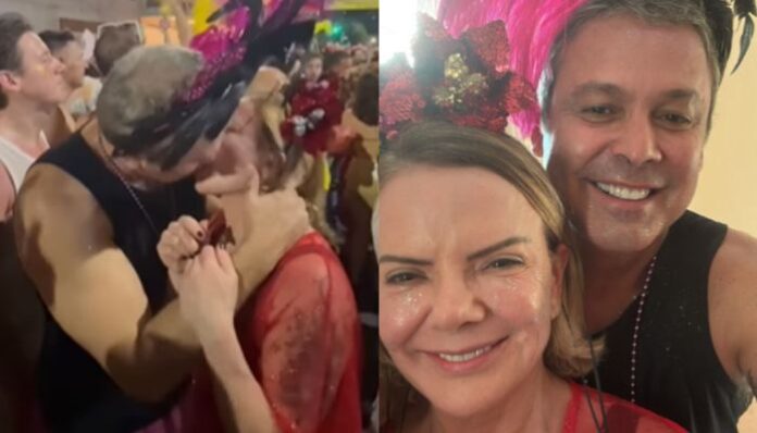 O deputado federal Lindbergh Farias (PT) publicou uma foto beijando a ministra das Relações Institucionais da Presidência, Gleisi Hoffmann (PT), sua namorada durante o bloco, Embaixadores da Folia, no Centro do Rio de Janeiro.