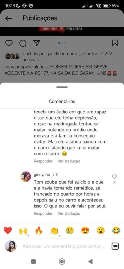 Segundo o Portal Comando Policial, a vítima fatal, no caso Iago, residia em Garanhuns e passava por um momento de depressão, após perder vários familiares em um grave acidente. O Comando Policial apurou ainda que na noite de terça-feira (09), o jovem teria enfrentado uma crise depressiva, tomado vários remédios, e havia relatado aos familiares o desejo de tirar a própria vida “se jogando contra um carro”.